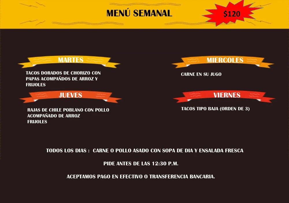 📅 De martes a viernes disfruta un platillo diferente cada día.